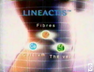 Vient alors l’essentiel du propos image : le schéma virtuel (photo 6). Cette image renvoie avec force à l’iconographie scientifique (documentaire, scanner, cliché médical…). L’image de synthèse est une reconstitution qui s’assume « irréelle » précisément par sa capacité à montrer ce que l’œil ne peut voir). Enfin le quadrillage en lignes croisées, type image informatique : les fameuses lignes qui avait été encodées auparavant et qui se trouvent justifiées ici. Le buste coupé reprend la thématique du fragment ; de plus, le corps sans tête permet une identification de tous (puisque anonyme). Cet extrait de corps permet aussi de diriger l’argumentaire de l’image sur un aspect « technique » (à la limite de l’autopsie). Le nom « Lineactis » a deux fonctions : « faire médicament » (consonance latine comme dans l’industrie pharmaceutique), et le « TM » fait penser qu’il s’agit d’une nouvelle formule brevetée par les chercheurs de chez Nestlé.