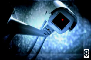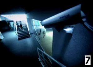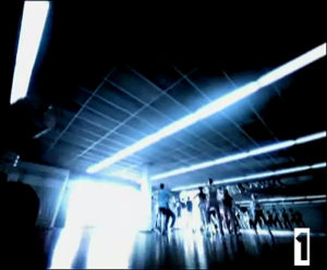 Le 10ème plan (un peu plus qu’une seconde) revient à l’entraînement, suivit de 2 plans des personnages dansant : plan 11 fragment de ventre (encore un) qui dure seulement 12 images, et plan américain (36 images, soit 1,5 seconde). Puis l’on passe à la séquence de la caméra de surveillance (photo 7), où tout se joue par la rapidité du montage, quasi subliminal. Plan en plongée (comme la caméra montrée) avec des lignes obliques et des cassures géométriques qui augmentent la dynamisation du regard tout en pointant agressivement les personnages. Il ne dure que 16 images (soit 0.6 seconde).