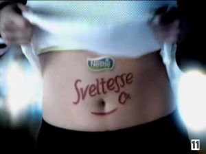 e déjà prêts à l’emploi), disposés en packs sur des lignes croisées qui font se remémorer l’argument scientifique du schéma. Les packs indiquent une notion de cure, produit qu’il faut consommer régulièrement pour être efficace (on aurait pu présenter un yaourt seul, cela aurait eu un autre effet). Le sigle « nouveau » attire l’oeil par l’apparition en mouvement, attise l’envie, comme tout ce qui est nouveau dans l’imaginaire consumériste. Fond blanc, touches de bleu, rappel du rouge par le logo « nouveau ». Cette composition de couleurs se retrouve dans le plan final du ventre avec la marque Nestlé. Il répète une dernière fois tout l’argumentaire du spot : personnage-buste qui soulève son T-shirt, montre son ventre sur lequel est inscrit le produit et incrusté le logo de la marque. Celui-ci avance en zoom, encore une fois parce que l’œil est attiré par un mouvement.