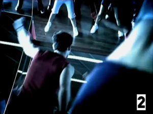 4ème plan en contre-plongée (photo 2) : les lignes du plafond se reflétant sur le sol produisent un troisième encodage. En 1er plan les hanches d’une protagoniste, en second plan le buste de l’entraîneur, en arrière plan le miroir qui reflète des jambes : ces fragments de corps sont repris sur tout le spot, et relèvent donc du principe de redondance.
