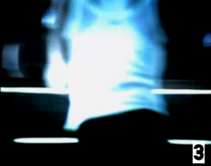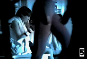 On passe alors en vision subjective de la caméra (photo 9), vue d’ensemble sur les 2 personnages féminins qui dansent à l’intention du surveillant, c’est-à-dire le spectateur lui-même. A l’évidence cette caméra agressive met le film en abyme ; le regard de la surveillance (ici supposé masculin) renvoie au véritable sujet du spot : le regard de l’autre, celui qui examine le corps. On donc doit travailler pour lui plaire, c’est-à-dire consommer le produit : ce plan caméra-subjective est une injonction subtile, qui force à prendre en compte le regard de l’autre.